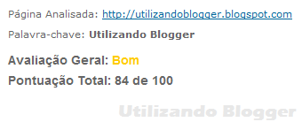 Agora, irá mostrar um relatório analisando os seguintes fatores: Server, Title Tag, Image Tag, Heading Tag, URL, Meta Keywords Tag, Meta Description Tag. Minha pontuação foi 84 de 100, para mim foi excelente pois tenho apenas 3 meses de Blog, e já otimizei bastante o Utilizando Blogger. Veja na Imagem abaixo: