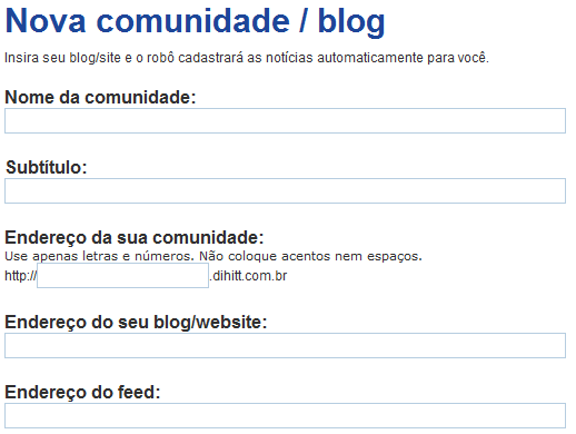 Nome da comunidade: Nome de seu blog, Subtítulo: Uma frase do seu blog, por exemplo, Utilizando Blogger é o nome da comunidade e o subtítulo é Dicas - Tutoriais - Códigos e Ferramentas para Blogs, Endereço de sua comunidade: Se preferir coloque o nome de seu blog, Endereço do seu blog/website: O URL de seu blog, Endereço de feed: URL de seu feed.